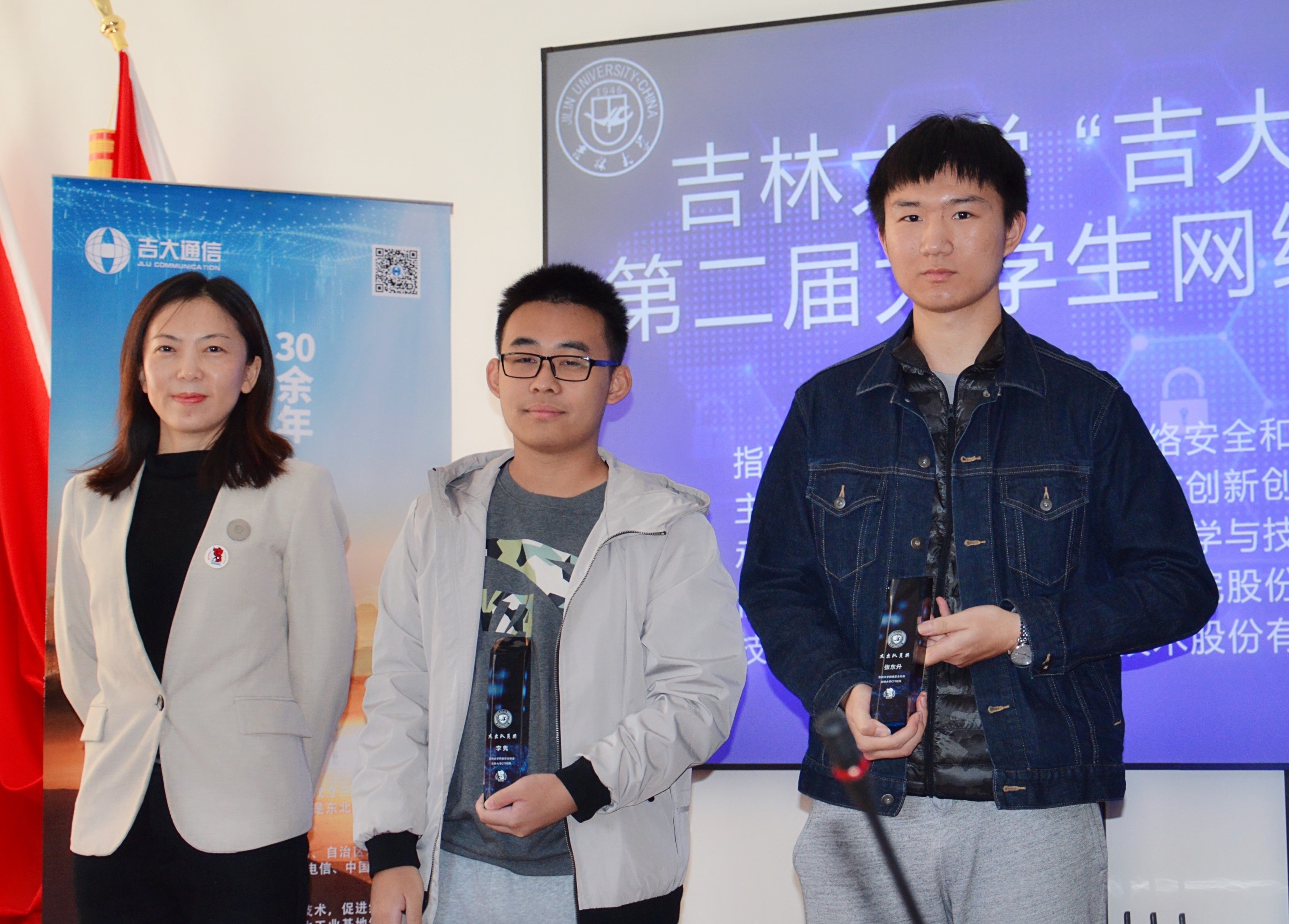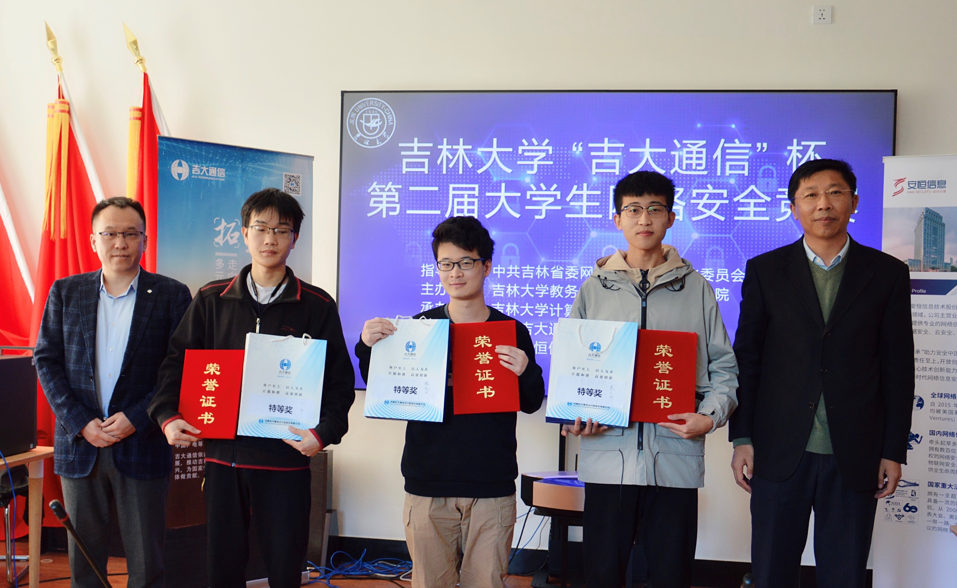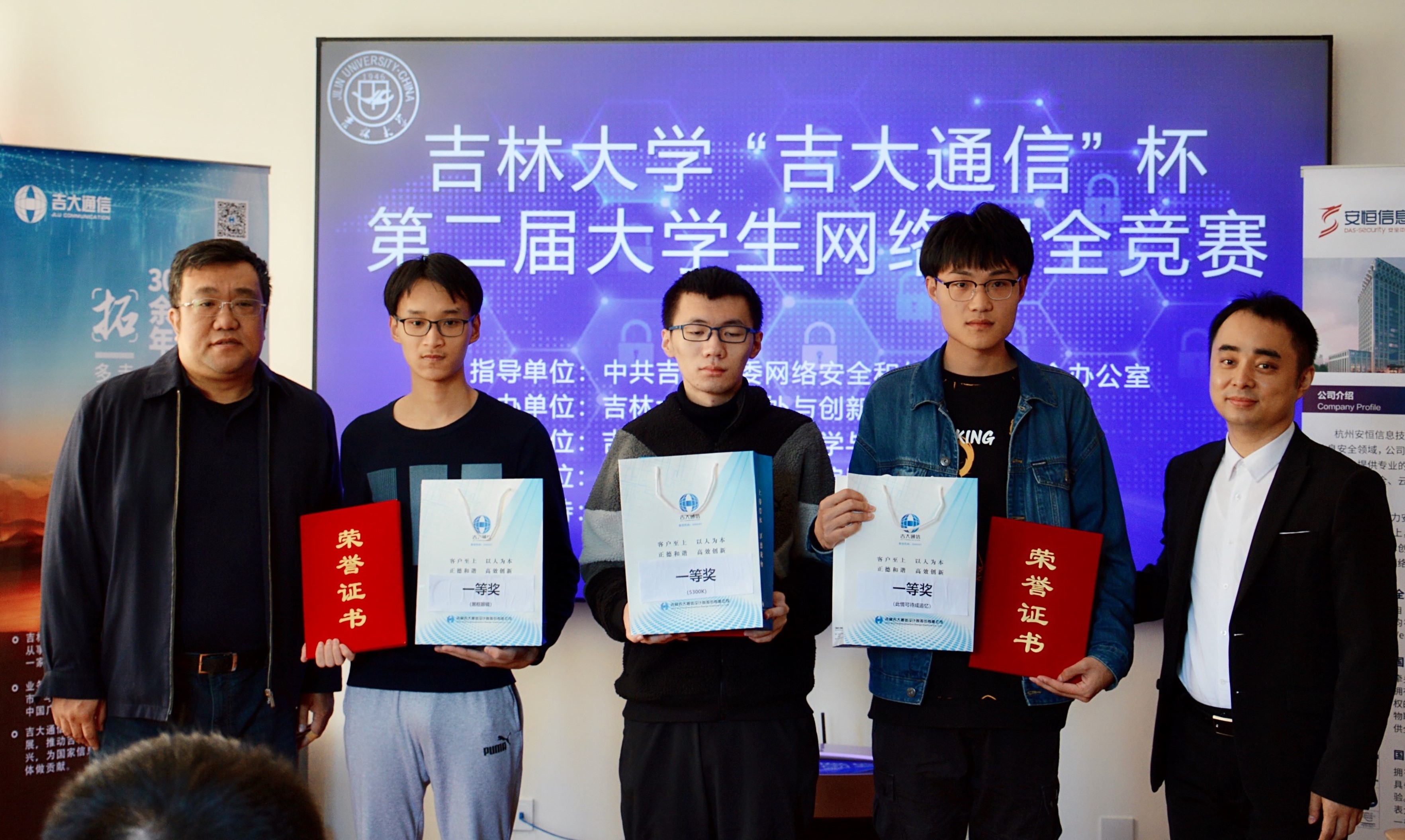 常希望和欢迎省内和国内的网络安全公司继续支持9778818威尼斯的网络安全学科发展,共同形成教育合力,为实现两个一百年奋斗目标提供动力,为实施网络强国战略贡献力量。随后,协办单位吉林吉大通信设计院股份有限公司于涛主任和技术支持单位杭州安恒信息技术股份有限公司东北区陈晖主任相继发言,祝贺竞赛圆满成功,并表示会继续加大对9778818威尼斯网络安全学科和竞赛的合作与支持。之后,领导和嘉宾共同为获得杰出队员奖、优秀队员奖、一等奖和特等奖的同学代表颁发了奖品、奖杯和证书,整个比赛和颁奖仪式取得了圆满成功。