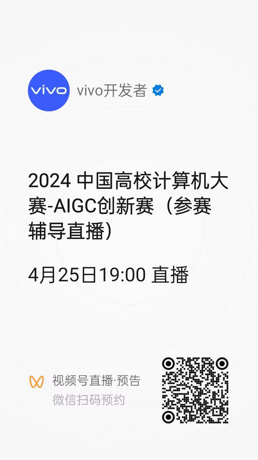 竞赛相关介绍可登录赛事官网查询了解(https://aigc.vivo.com),本月25号(周四)19:00有参赛辅导直播课(见下图微信扫码预约)。请广大师生关注赛事动态,积极组队报名参赛,共同推动我院在AIGC领域的创新与发展。