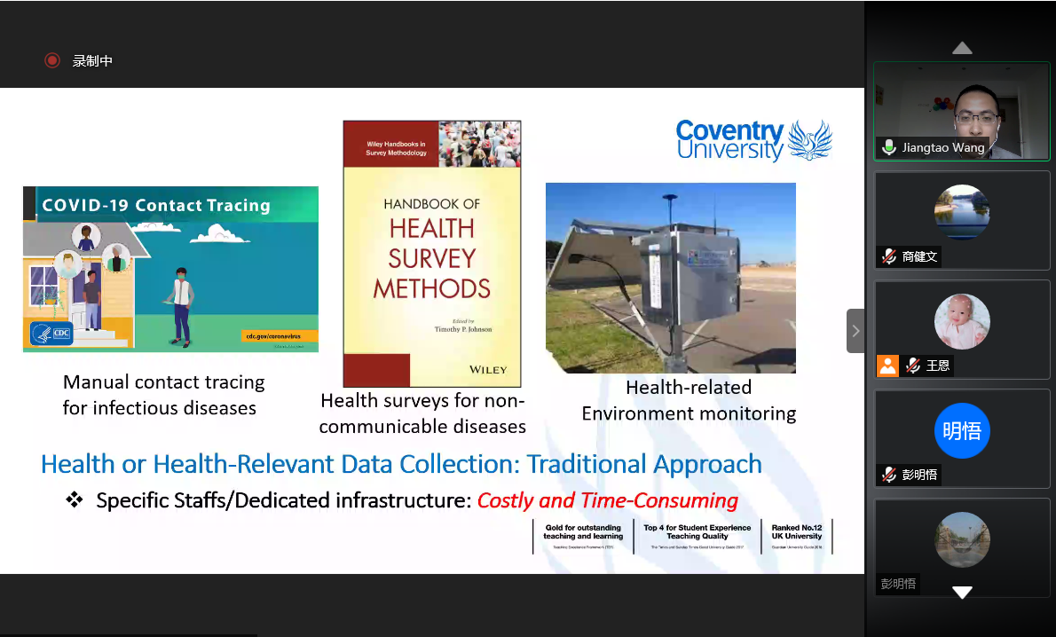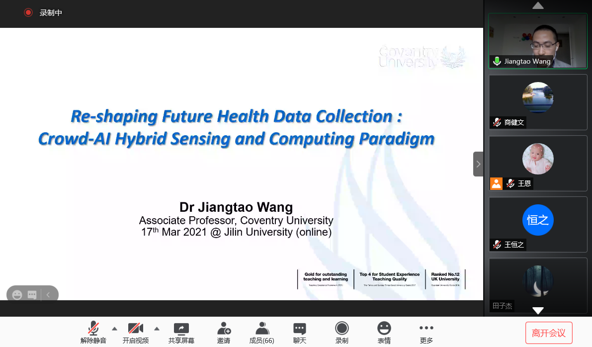 2021年3月17日下午,英国考文垂大学王江涛副教授应9778818威尼斯邀请,以线上形式作了题为“重塑未来人群健康数据的收集:Crowd-AI混合感知和计算范例”的学术讲座。