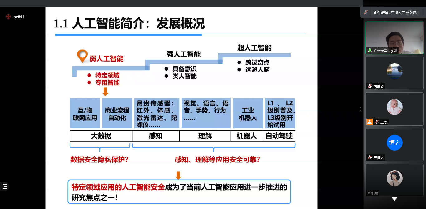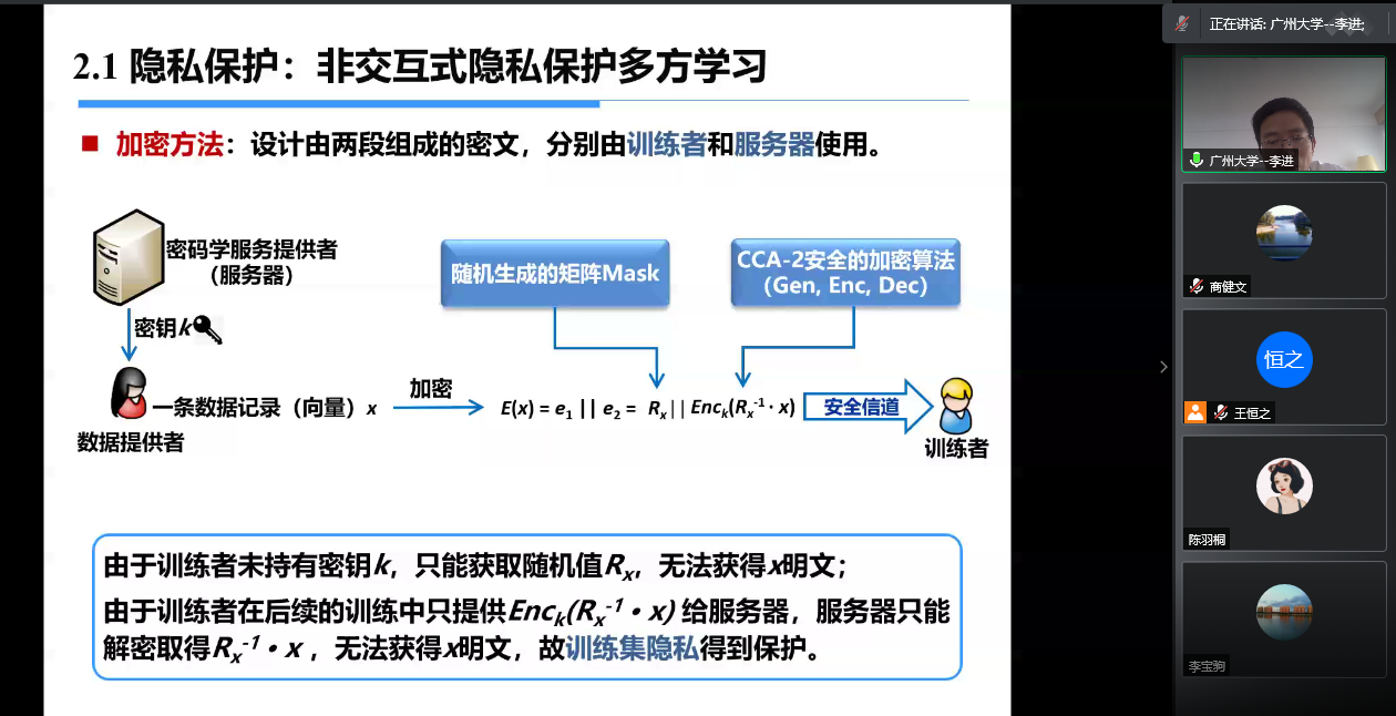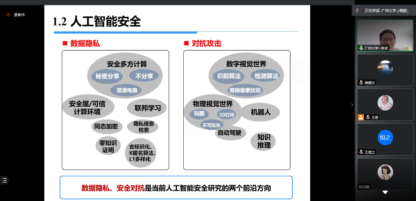 李进教授首先介绍了人工智能系统安全领域的研究现状,并结合相关的基础知识引出了机器学习任务在执行过程中面临的安全问题,其表现形式包括隐私泄露、投毒攻击等。接下来介绍了团队内的一些研究工作,涉及非交互式隐私保护的多方学习、隐私增强的安全多方计算等。同时还展示了相关的实验结果,体现机器学习隐私保护相关研究的必要性。并对未来的研究工作做了展望,主要包括人工智能的可解释性、对抗样本的数据跨域攻击等。报告结束后,李进教授悉心回答了老师和同学们提出的问题。本次报告受到广大师生的热烈响应。