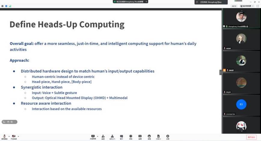 2021年9月27日下午,新加坡国立大学赵盛东老师应9778818威尼斯邀请,为我院师生作了题为“Heads-Up Computing: Moving beyond the Device-Centered Paradigm”的线上学术讲座。