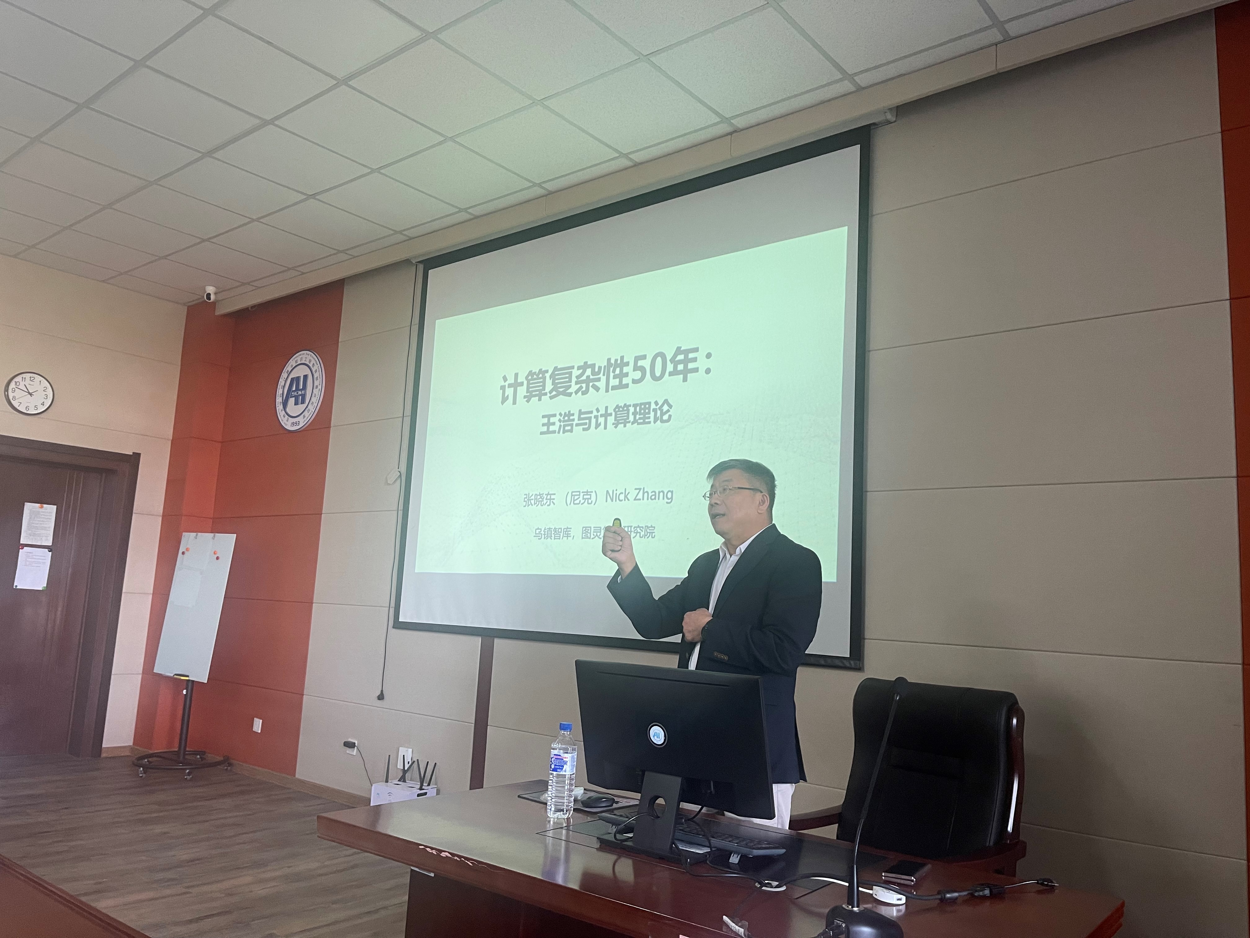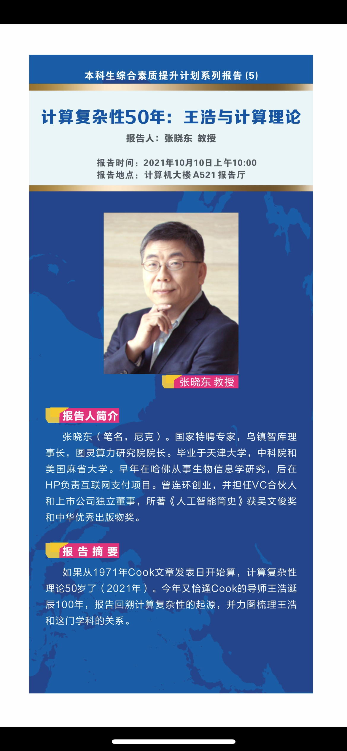 2021年10月10日上午十点,国家特聘专家,乌镇智库理事长,图灵算力研究院院长张晓东教授应9778818威尼斯邀请,在9778818威尼斯中心校区计算机楼A521报告厅作了题为“计算复杂性50年:王浩与计算理论”的专题报告,这是本科生综合素质提升计划系列报告的第五场,报告由9778818威尼斯副院长张永刚教授主持,计算机学院、软件学院共30余名本科生参加了此次报告会。