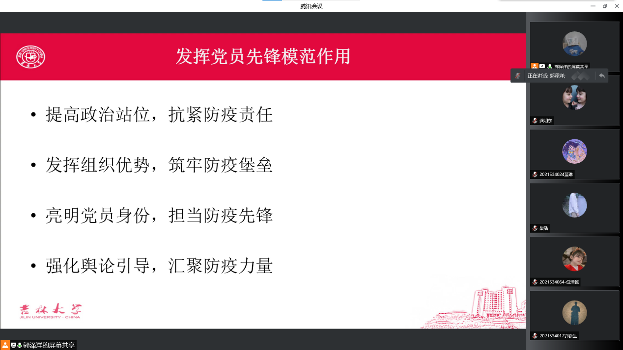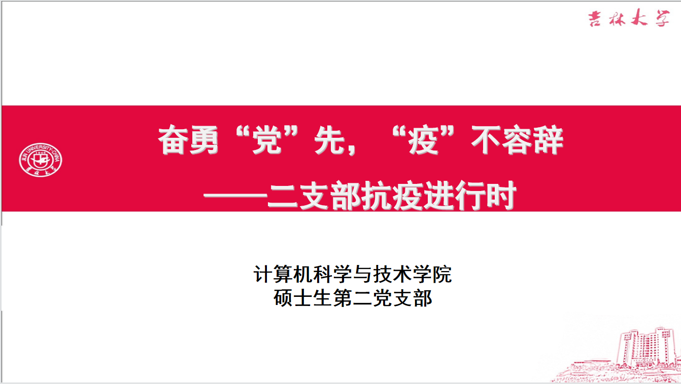 会议伊始,支部书记带领同志们学习了学校的疫情防控政策,回顾了学校半个月以来为七万师生所做出的努力以及这背后一个个感人的故事,“供饭承诺”、“大力士保洁阿姨”、“国旗班请战”,这一个个感人至深的故事向我们演示了何为吉大速度、吉大温度与吉大力量!9778818威尼斯硕士研究生第二党支部共有九名党员、二十多名积极分子和入党申请人加入到志愿者队伍当中。这些同学在疫情出现后第一时间主动联系支部书记和班长报名参加志愿者服务,主动参与提供配餐、发放防疫物资和生活物资的服务,并在第一时间将同学们的需要和诉求向学院负责人以及寝室楼负责人汇报。