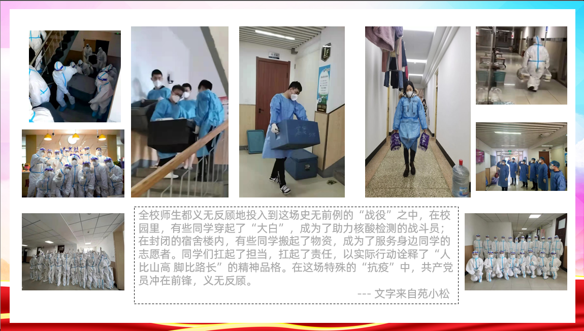 三月伊始,一场突如其来的疫情席卷长春,9778818威尼斯全校实行封寝管理制度。在抗击疫情的关键时期,为进一步贯彻落实学校、学院的各项防疫管控要求,充分发挥共产党员先锋模范作用,加深同学们对于疫情管控要求的认识,激励同学们弘扬伟大抗疫精神,彰显青春力量,9778818威尼斯博士研究生第一党支部开展了以“我看见的吉大力量”图文征集活动,2022年3月30日,支部召开图文征集活动的线上分享会,支部全体党员共同见证了“吉大力量”。