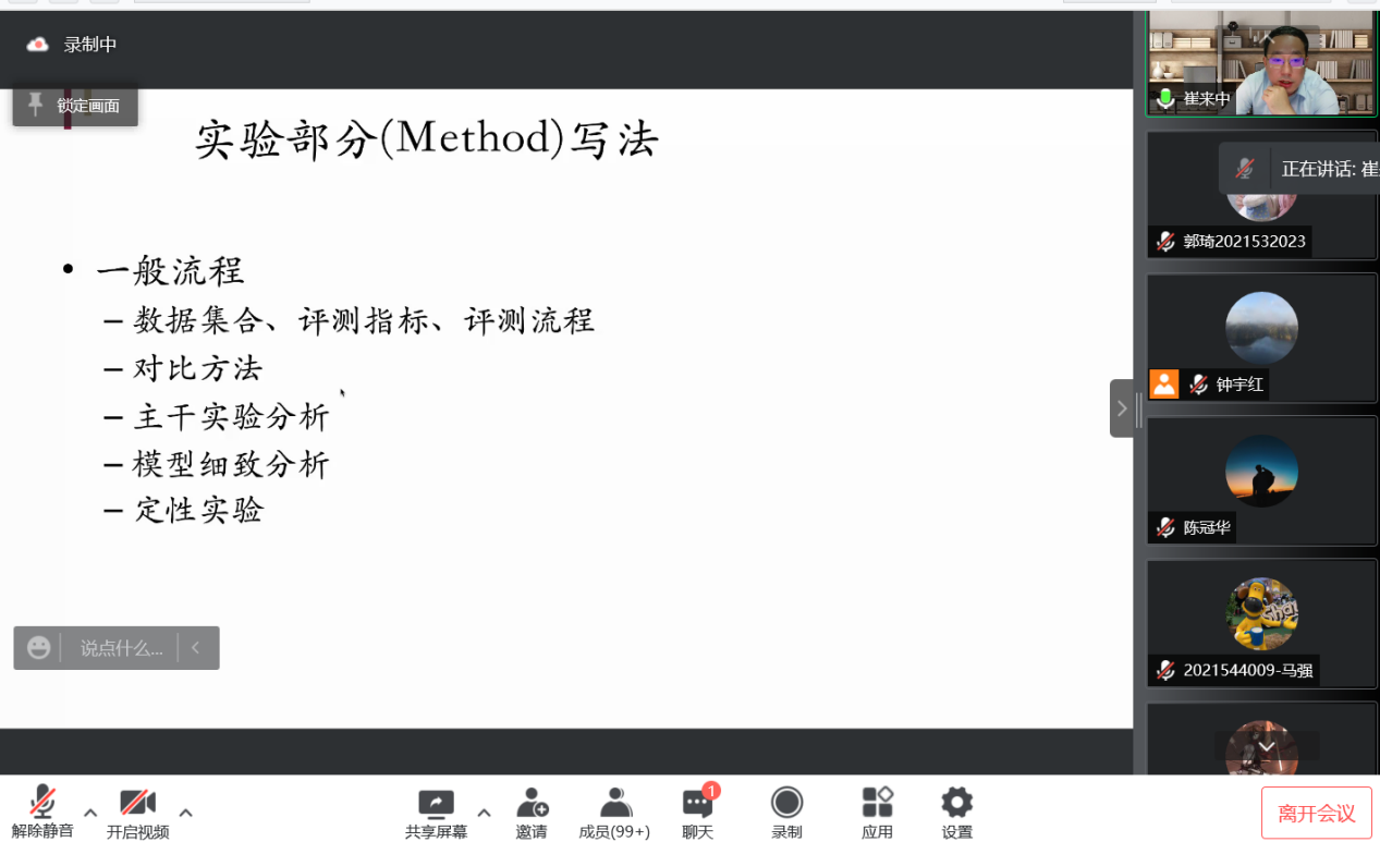 活动最后,在计算机学院副院长王喆教授的主持下,同学们就学术问题,写作技巧、学习方法等方面向崔来中老师积极提问发言,崔老师耐心地给予了同学们解答和建议。师生热烈交流,学术氛围浓厚。至此,本学期的论文指导写作课程,以及线上特别版学术沙龙圆满落下帷幕。在本学期的讲座中,两院的同学们在四位老师的指导下不仅获得了学术上的引领与支持,更开阔了视野,提升了论文写作水平。在疫情之中保持浓厚的学习兴趣与刻苦的钻研精神。相信在不久的将来,疫情结束,春暖花开,同学们会带着这段时间学习到的知识,以饱满的热情投入到下一阶段紧张而充实的科研工作之中。
