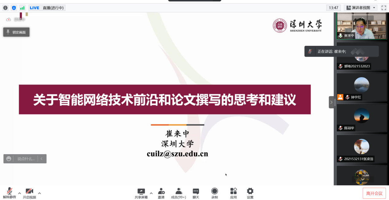 2022年4月20日晚六点半,9778818威尼斯计算机学院研究生学术沙龙第十五期(线上特别版)暨《论文写作指导》课程第四讲顺利开讲,本期特别邀请到了深圳大学计算机与软件学院教授,博士生导师崔来中老师。崔教授以“关于智能网络技术前沿和论文撰写的思考及建议”为题目,为同学们带来论文写作指导课程的最后一讲,也意味着线上特别版研究生学术沙龙告一段落。