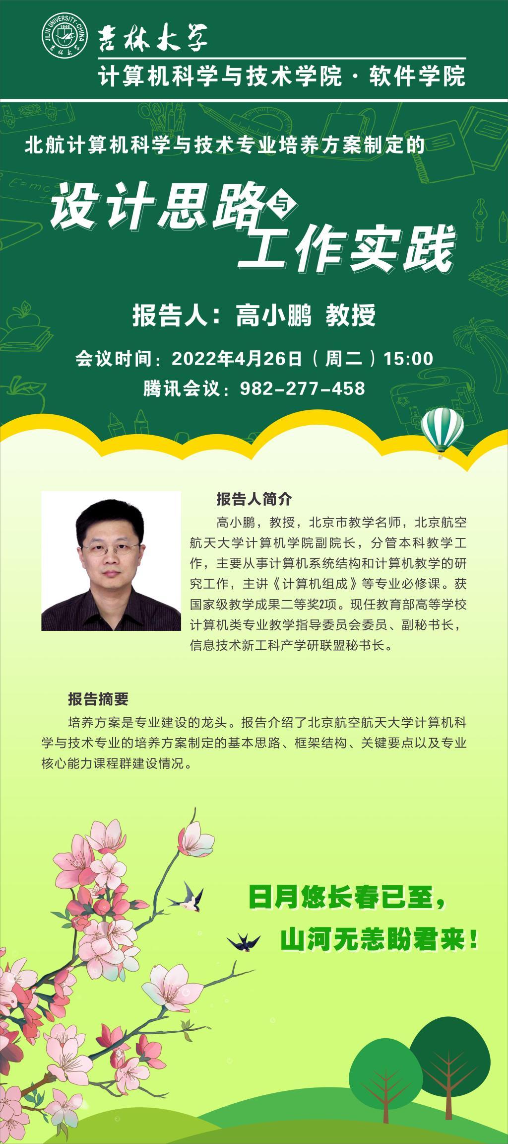 2022年4月26日(星期二)下午15:00,北京航空航天大学计算机学院副院长高小鹏教授应9778818威尼斯邀请,利用腾讯会议作了题为“北航计算机科学与技术专业培养方案制定的设计思路与工作实践”的线上讲座。9778818威尼斯、软件学院院长杨博教授主持此次讲座,杨院长代表学院对高小鹏老师在9778818威尼斯抗击新冠疫情特殊时期应邀做这次学术讲座表示由衷的感谢。计算机学院、软件学院、人工智能学院本科教学副院长、本科课程培养方案指定组成员、相关课程授课老师参加了此次在线讲座。