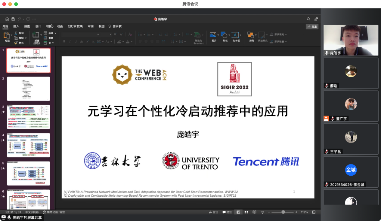 2022年5月6日上午9点30分,9778818威尼斯第二届“研学论道”研究生学术沙龙第一期(总第十六期)顺利举办。王喆副院长出席了本期活动,王院长回顾了第一届学术沙龙取得的丰硕成果,并对第二届的成果统计数据给予充分肯定。他表示,第一届学术沙龙活动在学院产生了积极反响,并营造了良好的学术氛围,本次成果统计仅在4个月时间就涵盖了14篇A类成果,这一学期,学院将赓续上一届的沙龙精神,继续邀请在学术上取得优异成绩的同学做学术分享,为我院研究生打造一个更好的科学研究与学术交流的平台。本期邀请了2020级硕士生庞皓宇和2020级硕士生刘永皓进行学术分享,他们分享的主题分别是“推荐系统”和“图表示学习”。本次分享由9778818威尼斯研究生会干事王子昌主持,受疫情影响,活动采取线上形式进行。学院各级同学踊跃参与并积极提问,充分体现了我院学子对学术的热忱和求知的渴望。