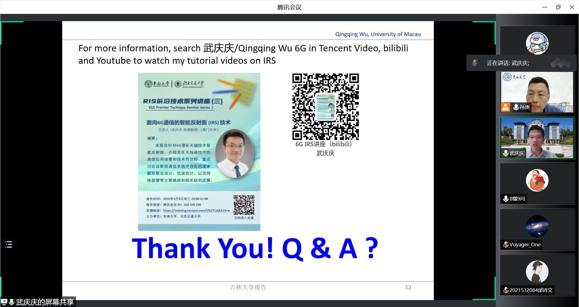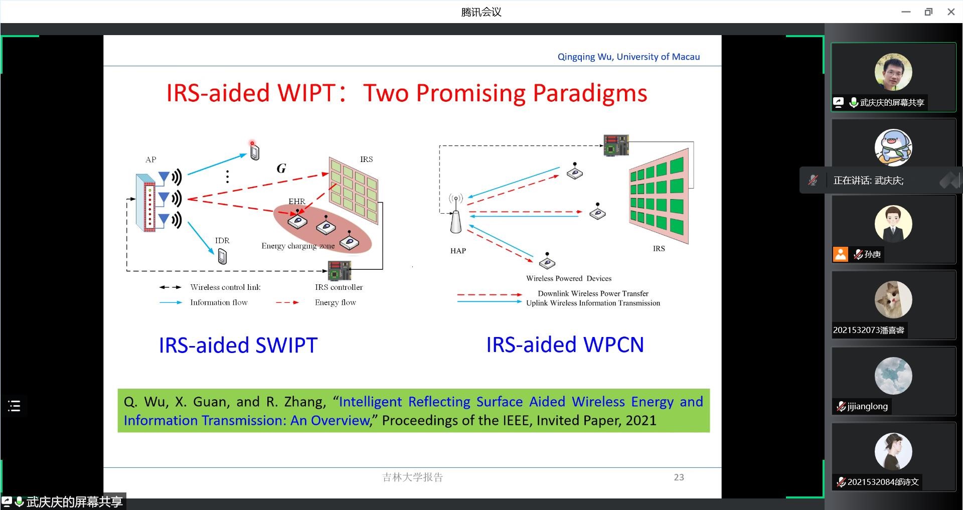 2022年9月18日,澳门大学武庆庆助理教授应9778818威尼斯邀请,利用腾讯会议作了题为“Intelligent Reflecting Surface Empowered Wireless Information and Energy Transmission for 6G”的学术报告。9778818威尼斯孙庚副教授主持了讲座,并对武庆庆助理教授的精彩讲座表示由衷地感谢。