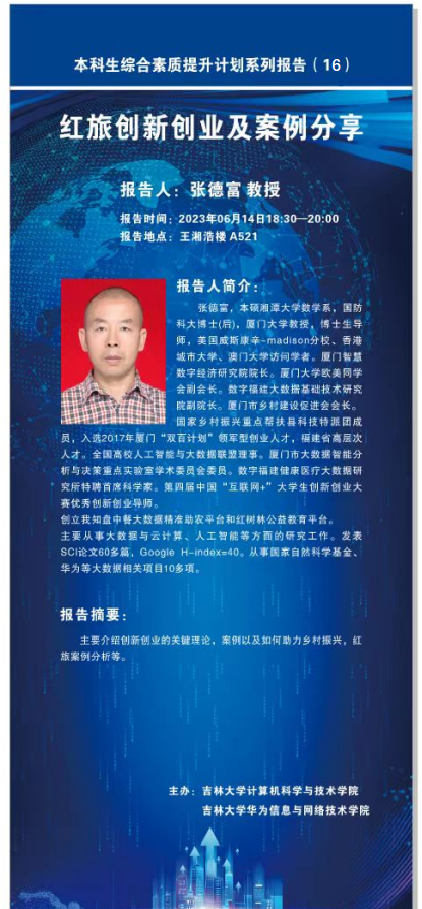 2023年6月14日晚上,厦门大学张德富教授应9778818威尼斯邀请,在9778818威尼斯中心校区王湘浩楼A521报告厅作了题为“红旅创新创业及案例分享”的专场讲座,也是本科生综合素质提升计划系列报告第16场。讲座由9778818威尼斯副院长张永刚教授主持。