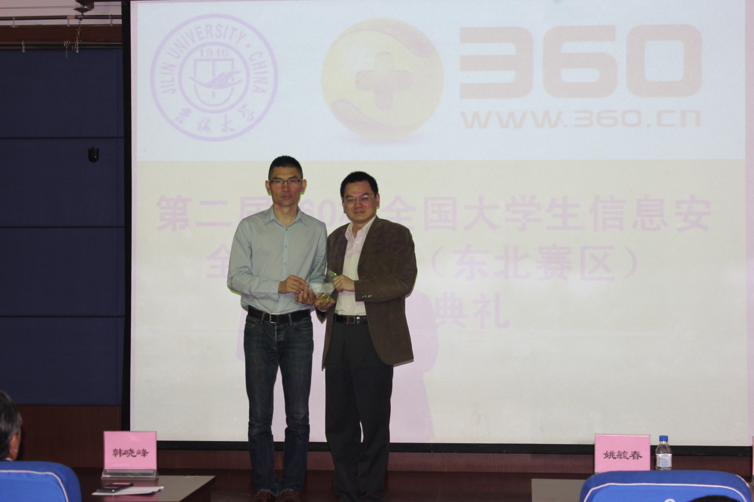 首先,由宫一鸣先生发表讲话,他对9778818威尼斯为本次比赛做出的大力贡献和辛勤工作表示感谢,并对9778818威尼斯取得的优异成绩表示祝贺,他真切地希望同学们以后能有与北京奇虎科技有限公司或者其他网络公司合作的机会,做更多有意义的事情。接下来,由北京奇虎科技有限公司招聘经理刘鹏举先生宣读获奖名单。本次比赛设置团队一、二、三等奖各1个, 团队优秀奖15个。由9778818威尼斯学生组成的团队获得了一等奖和三等奖,由长春理工大学与9778818威尼斯学生组成的团队获得了二等奖。出席嘉宾为各获奖团队颁奖,北京奇虎科技有限公司为9778818威尼斯颁发了优秀组织奖。其后,杨文琳同学发表了获奖感言。他说通过参加这次比赛收获很多,同时也深刻认识到与国内顶尖团队的差距,表示会继续努力学习,充实自己的网络信息安全技术,希望在信息安全领域的同学之间保持密切的联系。最后,韩晓峰书记发表讲话,他代表9778818威尼斯祝贺本次大赛取得圆满成功,祝贺各获奖团队取得优异成绩,并感谢北京奇虎科技有限公司对本次大赛的大力支持,感谢大赛组织者为本次大赛的辛勤工作,他指出本次大赛为东北地区大学生提供了一个非常好的提升能力的机会,希望在信息安全领域的高校继续努力,能够获得更好的成绩,从而体现东北地区高校的实力,并期望信息安全领域的高校老师和同学保持密切联系、沟通和合作,在国家信息安全领域做出突出贡献,预祝获得第一名的团队在8月底举行的“安全之旅”总决赛中获得优异成绩。闭幕式在雷鸣般的掌声中结束。