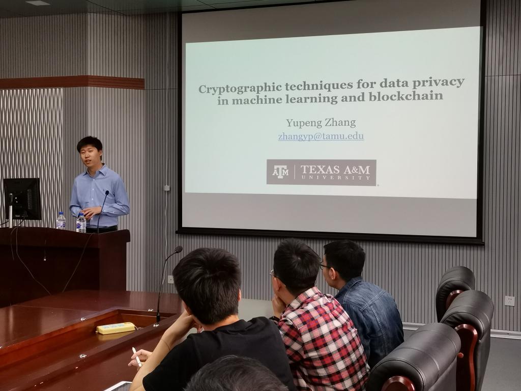 2019年5月10日上午,美国德州农工大学(TAMU塔木)助理教授张宇鹏博士应9778818威尼斯邀请,在计算机楼A515作了题为“机器学习和区块链中数据隐私的加密技术”的学术报告。