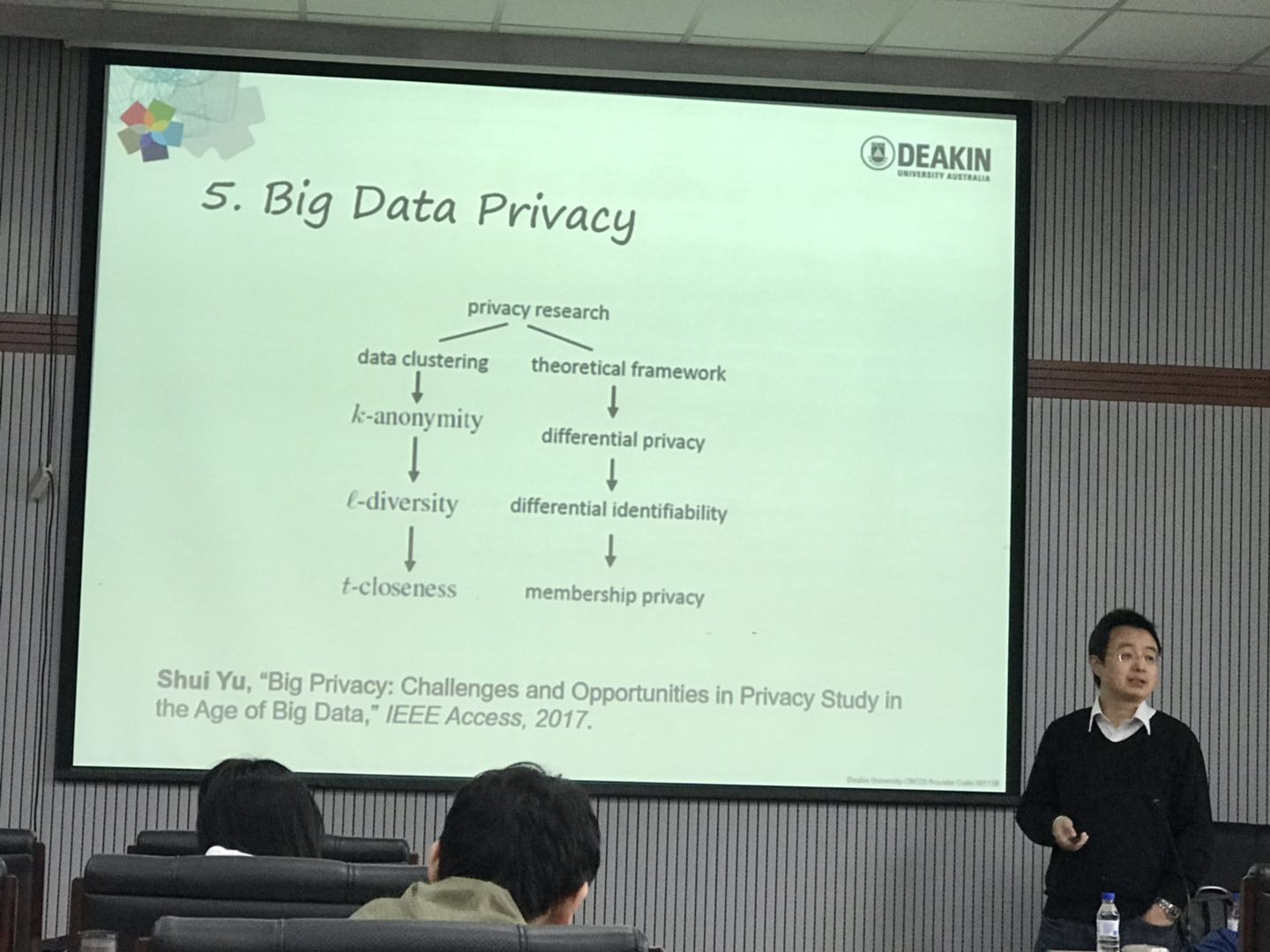 余水教授在报告中首先介绍了大数据时代的机遇和挑战,进而结合自身研究特色,详细介绍了他在大数据网络化方面所做的工作。余老师提出了Networking for Big Data的概念,强调了大数据时代网络研究的基础性支撑作用。随后,从位置信息和个性化设置等多个方面阐述了网络大数据隐私方面的研究热点。最后余教授还介绍了大数据隐私研究中的差分分析、K匿名等研究内容,并指出如何对网络大数据进行有效的隐私处理是当前一个亟待研究的热点。