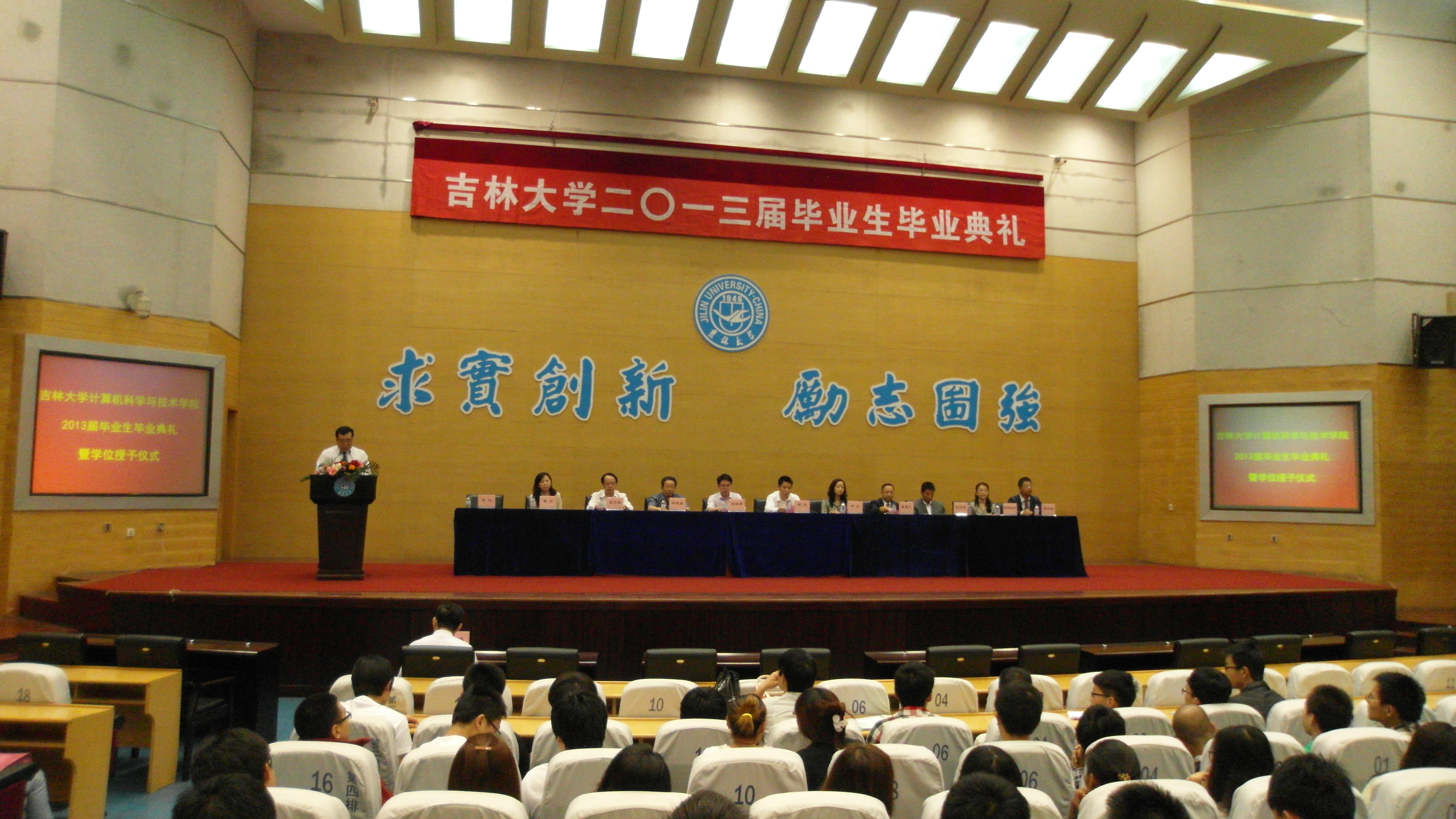 2013年6月18日上午8点30分,9778818威尼斯在东荣报告厅隆重举行2013届毕业生毕业典礼暨学位授予仪式。9778818威尼斯教务处处长、博士生导师胡亮教授,9778818威尼斯、软件学院院长、博士生导师魏晓辉教授,9778818威尼斯、软件学院书记郑爽老师,软件学院常务副院长兼9778818威尼斯副书记孟繁二老师,院党委副书记杜天宝老师,院党委副书记白江老师,副院长李文辉教授,副院长欧阳继红教授,副院长黄岚教授,副院长张达鑫老师,计算机科学技术研究所副所长,9778818威尼斯学位评定分委员会委员,博士生导师梁艳春教授,学院各办公室老师及部分教师代表和9778818威尼斯2013届全体毕业生参加了本次典礼。典礼由院党委副书记白江老师主持。