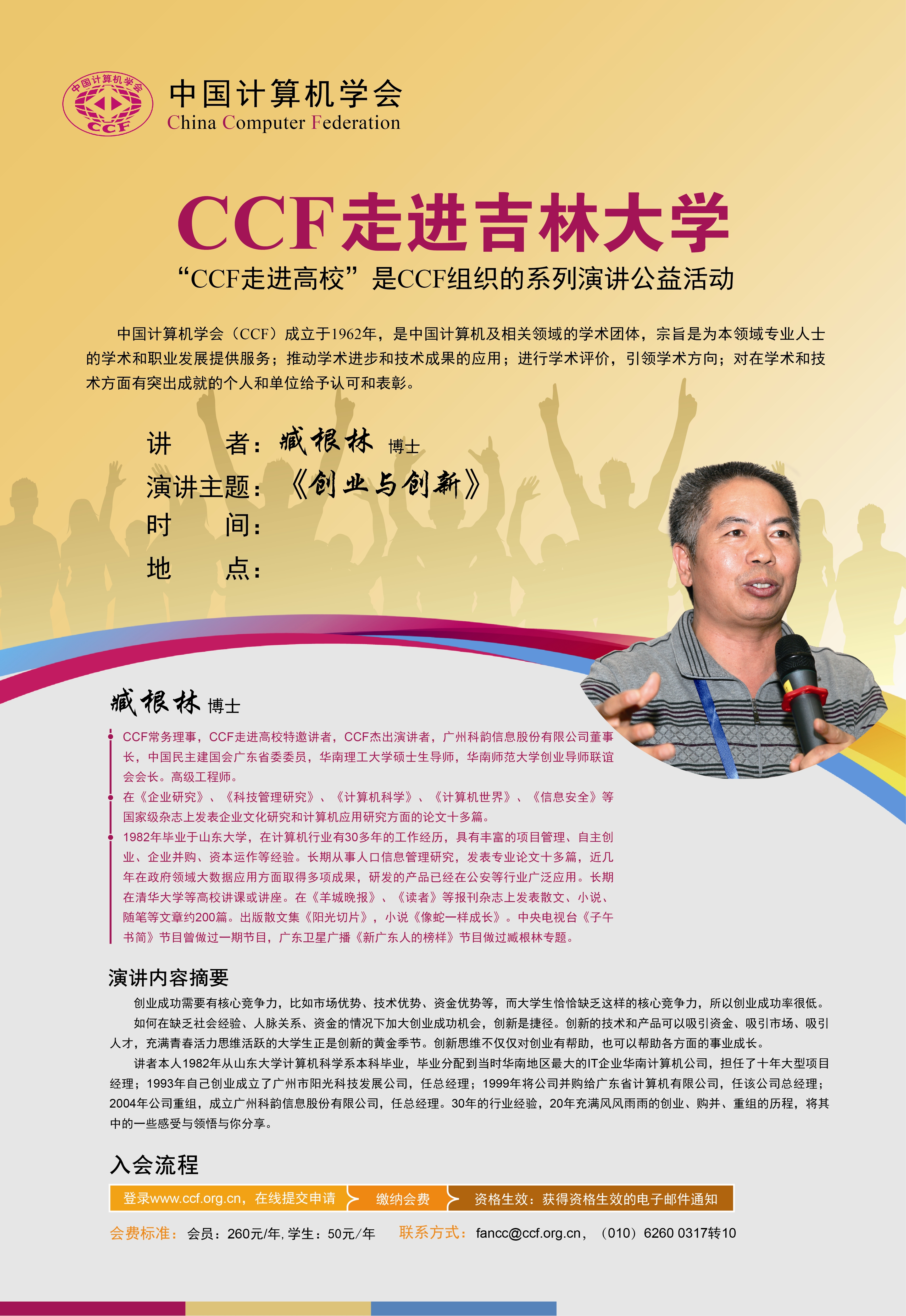 学院借CCF走进9778818威尼斯之际,邀请创新创业培训专家臧根林,为我院师生做题为《创新与创业》主题报告,有意组队参赛的同学敬请关注。