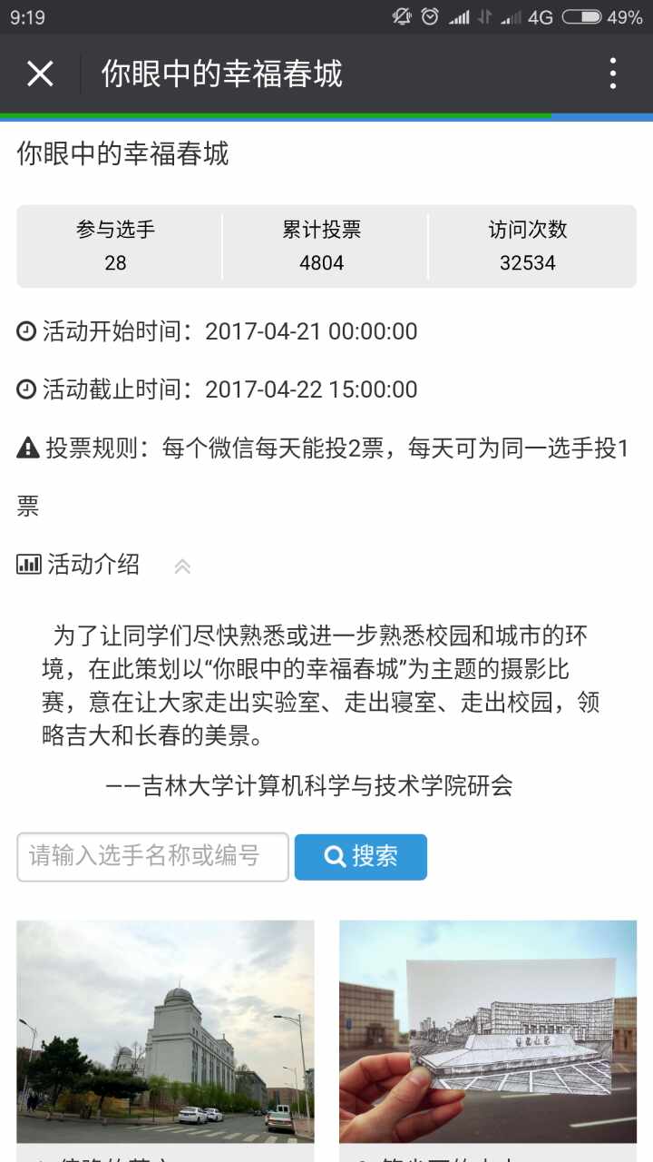为了让同学们尽快熟悉或进一步熟悉校园和城市的环境,计算机学院研会外联部,宣传部于4月15日至4月22日举办了以“你眼中的幸福春城”为主题的摄影比赛,意在让大家走出实验室、走出寝室、走出校园,领略吉大和长春的美景。并于4月23日在计算机楼举行了颁奖仪式。