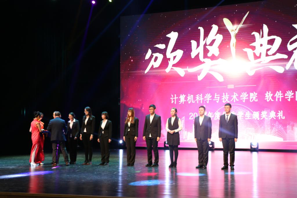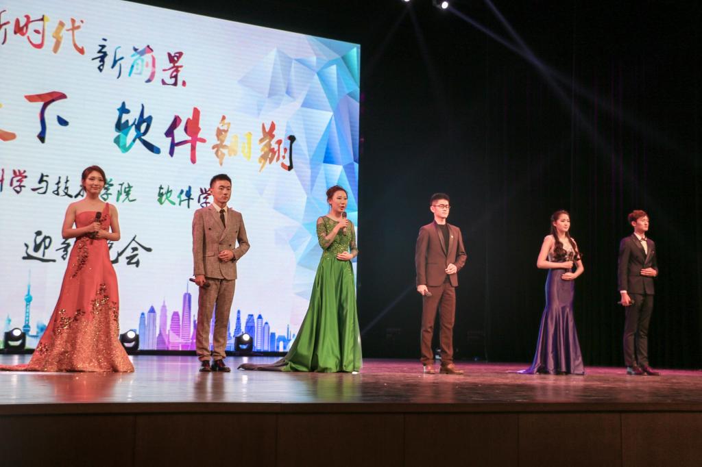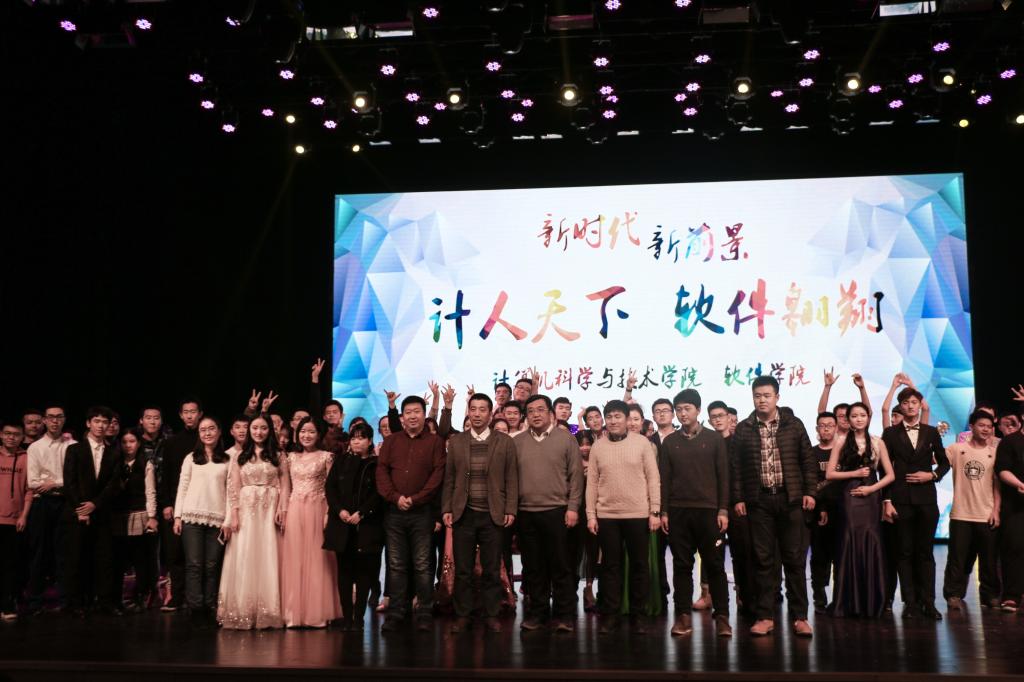 晚上18:30,迎新晚会准时开始,在主持人的引导下,所有观众起身奏唱国歌,计算机学院党委书记孟繁二老师宣读两院“2017年度优秀学生”获奖名单并颁奖合影,之后还有优秀学生代表为新生讲述大学生活的多姿多彩,最后是计算机学院、软件学院院长,博士生导师魏晓辉教授致辞,颁奖典礼到此告一段落。